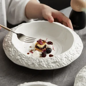 Restaurant Hotel Unique Irregular Rimmed White Diner Plates Porcelain Dessert Salad Dishes and Plates