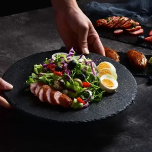 Круглые сланцевые каменные тарелки для ресторана, суши, каменный поднос, оптовая продажа, обеденная тарелка, черная сервировочная посуда для кейтеринга, ресторана, отеля