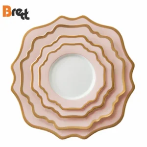 Новое поступление Цветная розовая зубчатая тарелка Белая керамическая обеденная тарелка с золотой каймой