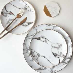 Оптовая продажа, керамическая тарелка с золотой оправой, мраморные прожилки, белая фарфоровая посуда с тиснением, тарелки с венами, набор керамических тарелок