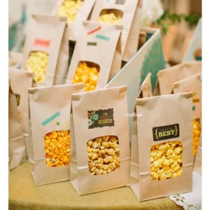 Изготовленные на заказ маслостойкие пакеты для попкорна, пищевые закрывающиеся пакеты из крафт-бумаги, мешок из крафт-бумаги с квадратным дном, закуска, попкорн, мешок из крафт-бумаги с окном