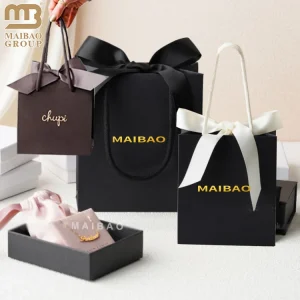 Оптовая продажа, роскошный тисненый черный бумажный пакет для ювелирных изделий с ручкой, логотип, одежда, подарок, упаковка для ювелирных изделий, бумажный мешок