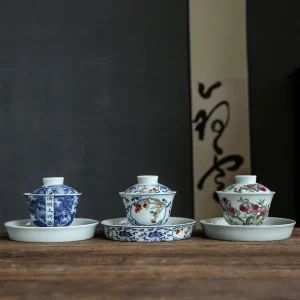 Antique Blue and White Glazed Porcelain Tea Bowl Covered Ceramic Kung Fu Saucer Set Chinese Design for Party Occasions