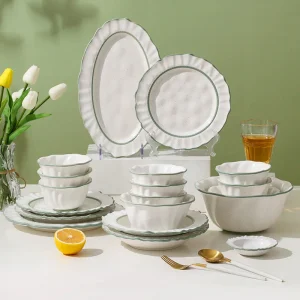 Nordic Luxury Porcelain Dinnerware Set Green Rim Embossed Lace Ceramic Dinner Plates and Bowl Tableware Sets
