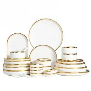 Nordic Italian White Ceramic Dinnerware Set 60pcs with Gold Rim Plant Pattern Porcelain Plate Sustainable Hotel Dining Set