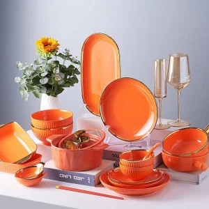 Оптовая продажа на заказ, скандинавская роскошная позолоченная оправа, оранжевый керамический набор посуды, тарелка, блюдце, посуда, тарелки и тарелки