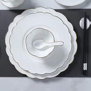 Принадлежности для отелей, костяной фарфор, белая посуда, набор тарелок, столовая посуда с золотой оправой, роскошный гостиничный костяной фарфор, изысканный набор костяного фарфора для ресторана