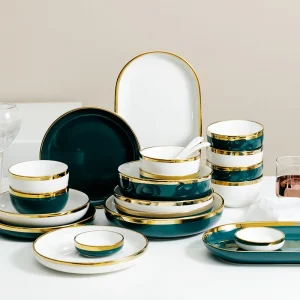 Элегантный скандинавский набор столовой посуды с золотой каймой, белыми, темно-зелеными, розовыми и светло-зелеными тарелками
