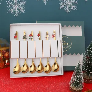 6pcs/set Christmas Gift Stainless Steel Coffee Stirring Spoon Dessert Fork Teaspoon With Gift Box for Xmas Party Tableware Decor
