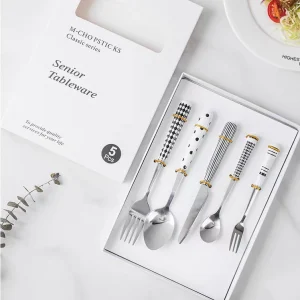 Gold Stainless Steel Cutlery Set Marble Ceramic Holder Ceramic Handle Flatware Dessert Fork Spoon