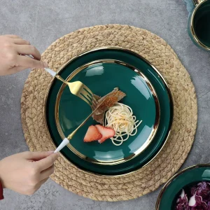 Роскошная керамическая тарелка, обеденная посуда, зеленая и золотая тарелка для ресторана, ресторана, керамическая посуда, обеденные тарелки с золотой оправой
