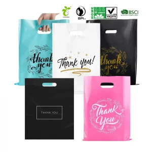 Изготовленные на заказ белые пластиковые сумки с ручками Прочная пластиковая сумка для переноски для бутиков Черные розничные покупки Пластиковые подарочные пакеты с благодарностью