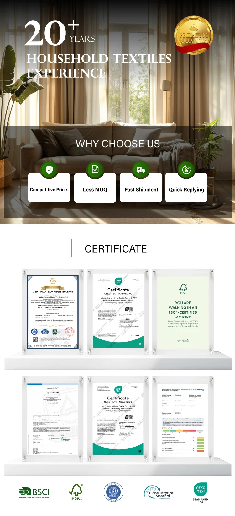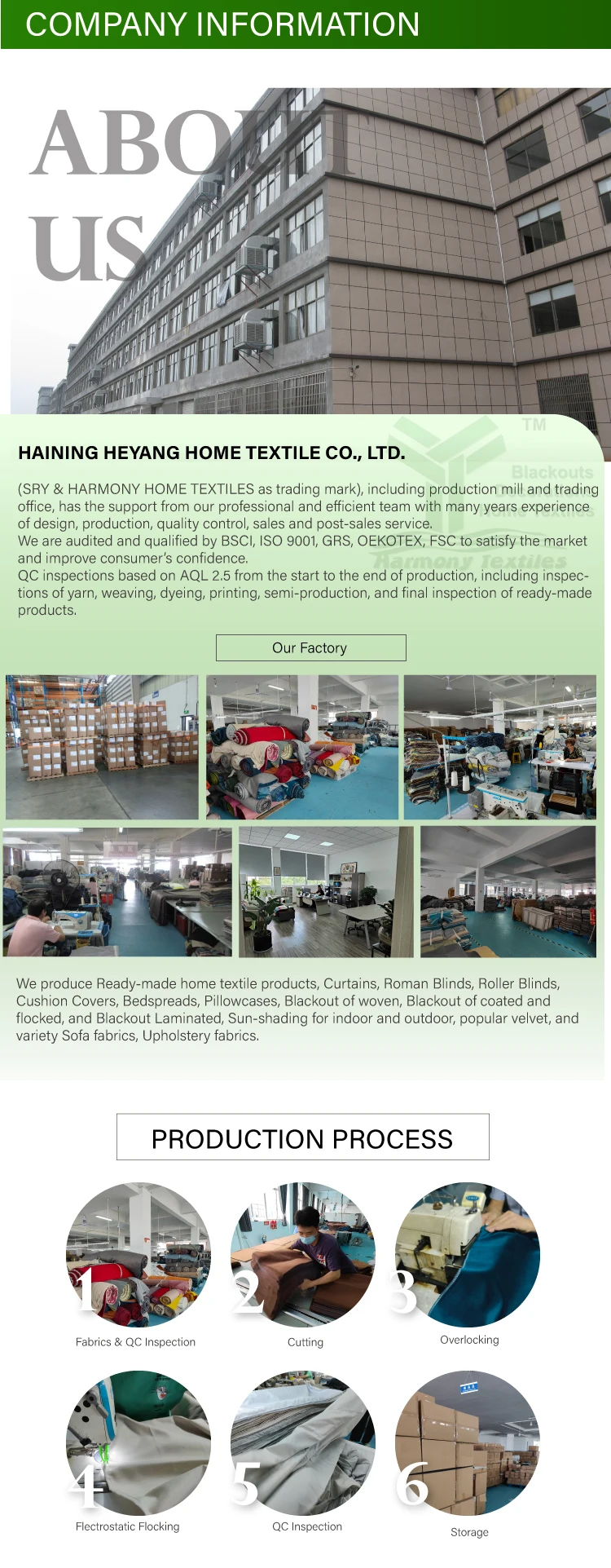 1. Who are we?We are based in Zhejiang, China, start from 2022,sell to Northern Europe(40.00%),North America(10.00%),SouthAmerica(10.00%),Oceania(10.00%),Western Europe(10.00%),Southern Europe(10.00%),Eastern Europe(10.00%). There are total about 11-50people in our office.2. How can we guarantee quality?Always a pre-production sample before mass production;Always final Inspection before shipment;3.What can you buy from us?Home Textile Ready-made Products & Fabrics4. Why should you buy from us not from other suppliers?Ready-made home textile products & fabrics, Blackout and Sunshading, Fabric weaving & Blackout coating, indoor household textiles & outdoor textiles, professional production team & business team with experience of 18years in lines of home textiles.5. What services can we provide?Accepted Delivery Terms: FOB,CFR,CIF,EXW;Accepted Payment Currency:USD,EUR,GBP,CNY;Accepted Payment Type: T/T,L/C,D/P D/A;Language Spoken:English,Chinese