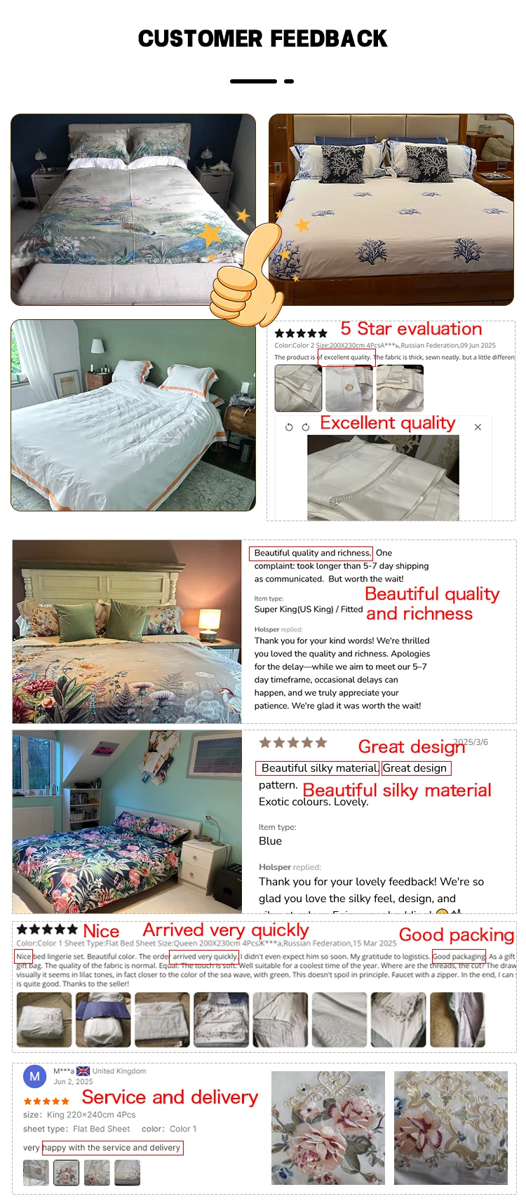 | Queen | 230X230cm (90.6*90.6inches) | 245*270cm (96.5*106.3inches) | 155*205+30cm(61.0*80.7+11.8inches) | 48*74cm*2 (18.9*29.1inches) |
